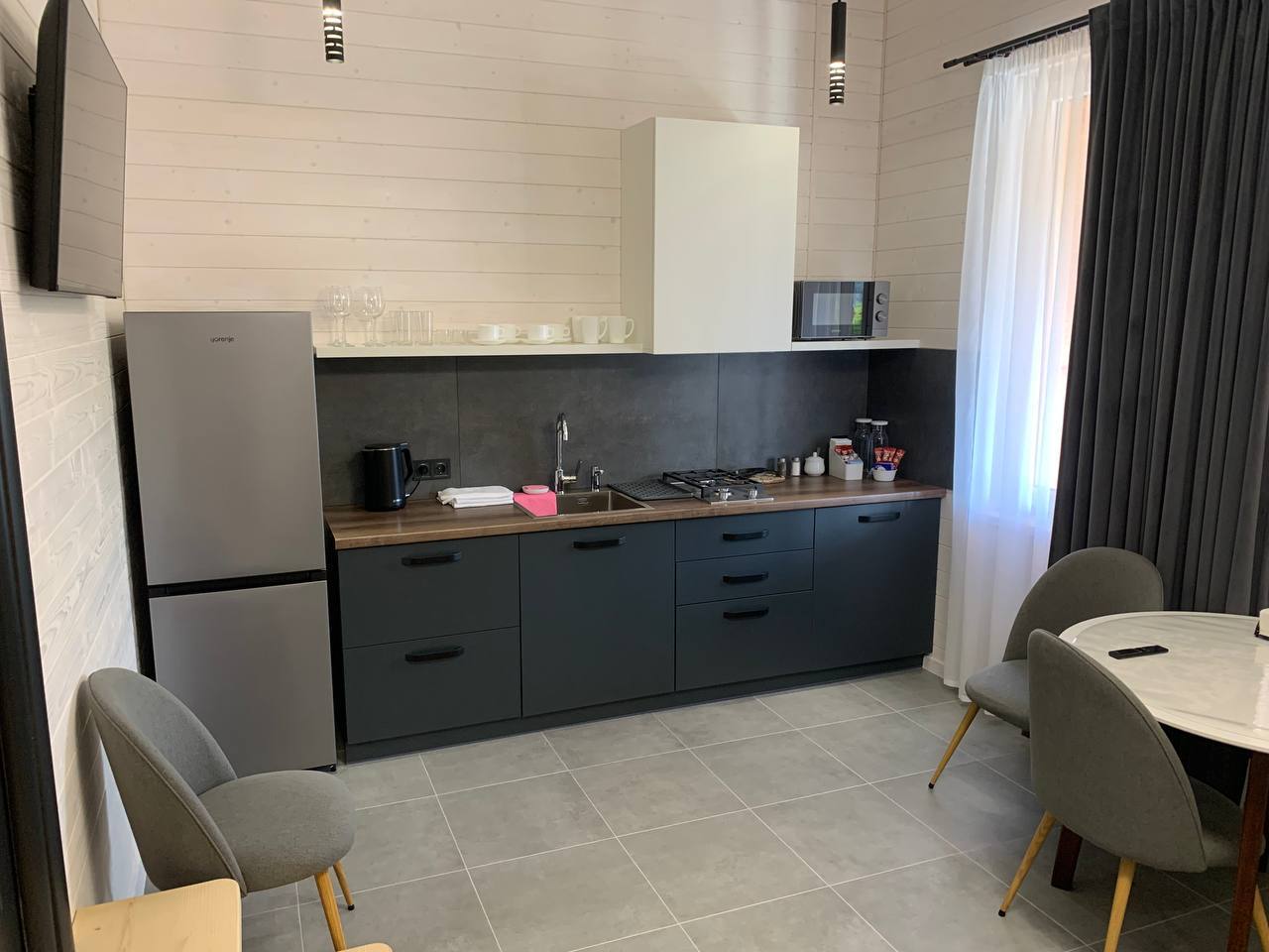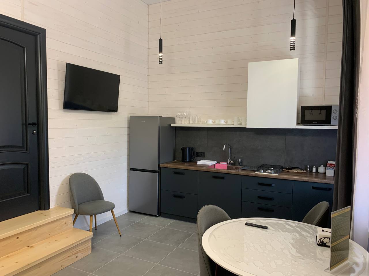 Звернувши стежкою ліворуч (ще перед входом у зал) Ви зможете потрапити у кухню, яка доступна кожному гостеві безкоштовно. Звичайно, кожен котедж обладнаний своєю міні-кухнею. Проте Вам може знадобитись додатковий посуд, каструлі чи сковорідки, міксер, духовка… Усе це можна знайти на загальній кухні.
